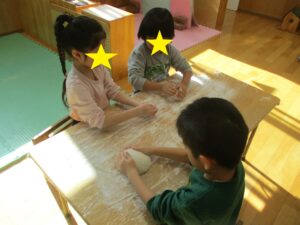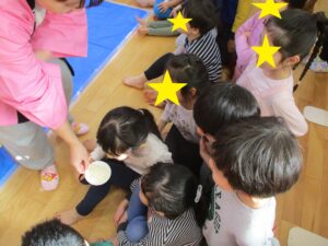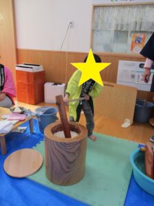炊き立てのもち米の匂いを嗅ぐと「なんかお米と違うー!!」「いい匂いだね~!」と嬉しそうにしていた子どもたち。いざ始まると、大きな声で「よいしょー!!!」とみんなで掛け声をしながら楽しんでいました☆