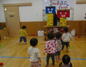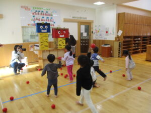 豆まきごっこは、ボールで段ボール鬼をやっつけます。小さいクラスの子は