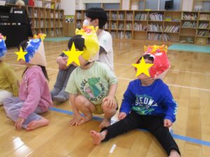 節分の由来を聞いたり、『まめまき』を歌ったり、豆まきごっこをしたりしました。