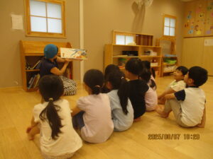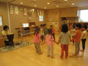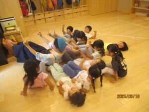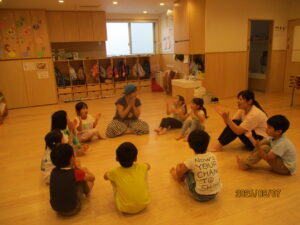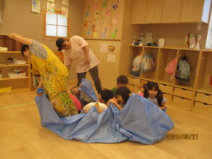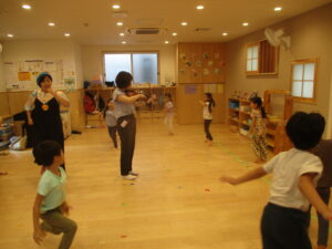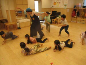 活動を通して:第4回目は子ども達が、自分で想像して体を動かす遊びをしました。様々なアイディアが出される中で、友達それぞれの考えやイメージが異なることや、友達からの意見の面白さや素晴らしさに気が付く機会になりました。今回の絵本「めっきらもっきらどぉんどん」は、子ども達の関心が非常に高い「妖怪」が登場するお話です。登場する妖怪の特徴を見事に捉えて、楽しそうに表現をしていました。