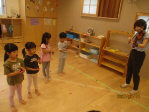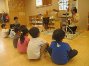 活動を通して:バイオリン奏者が来園しました。バイオリンとヴィオラを演奏いただき、楽器の大きさが異なることや音の高低の違いがあることに気づきました。また、園にあるカスタネット・すず・タンバリンとバイオリンのコラボで「やまのおんがくか」の合奏をしました。その場で好きな楽器を選んで演奏をしたのですが、初めてだと思えないくらい、リズムに合わせることができていました。