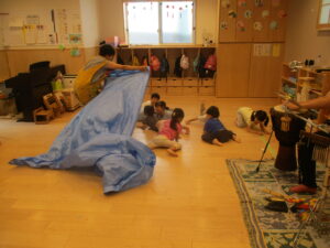 活動を通して:パーカッション奏者の演奏に合わせて表現活動をしました。パーカッションの音やリズムは、ユーモアがあるとともに心地よい気持ちになりました。子ども達も奏者の真似をして、リズム叩きをする経験をさせていただきました。写真のブルーシートは表現遊びの中で、海の中や船、宇宙船など様々なものに変身しました。